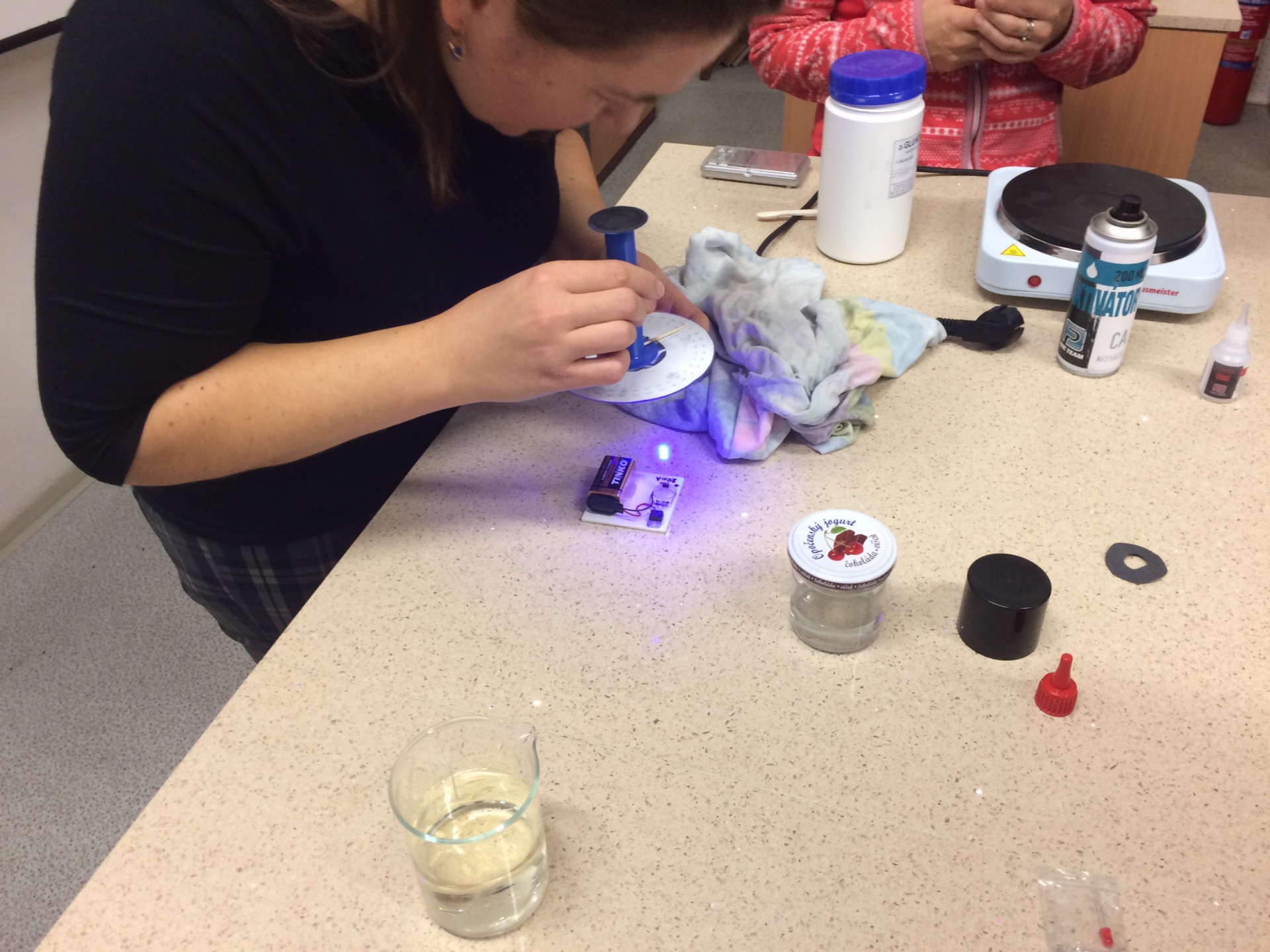Oscilační Stirligův motor s pracovním pístem zábrusové injekční stříkačky a s přehaněčem ze skleněných kuliček jsme sestavili z připravených "stavebnic", takže výroba byla takřka hračkou. Drobnou komplikací byla nutnost "rozchodit" písty sříkaček, aby chodily opravdu hladce. Výkon motoru totiž není nijak závratný :)