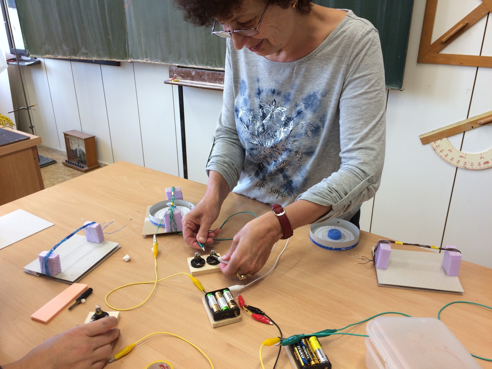 Setkání bylo věnováno studiu magnetického pole vodiče protékaného elektrickým proudem. Začali jsem Öerstedovým pokusem a skončili výrobou tangentové buzoly také v roli zkoušečky tužkových článků. Účastníci si odnesli rovněž žárovkový reostat pro regulaci proudu.
